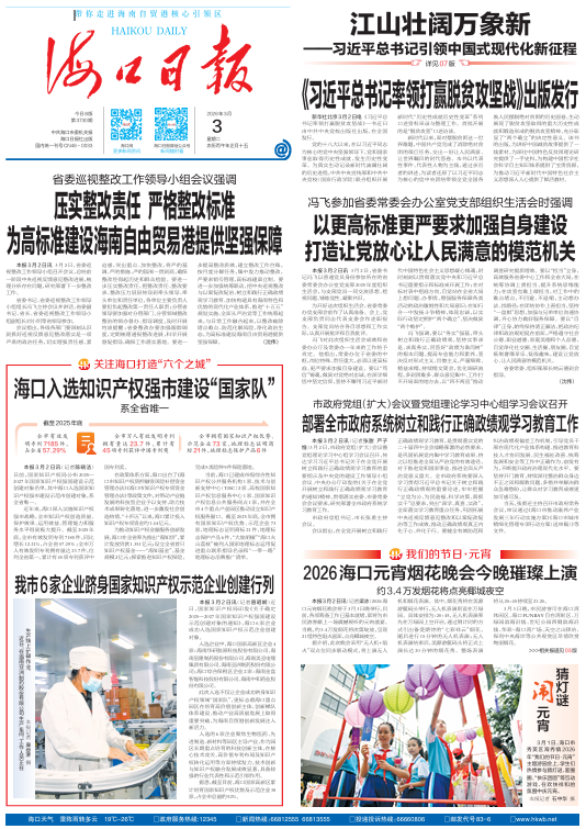 日前,国家知识产权局公布2025—2027年国家知识产权强国建设示范创建对象名单,其中海口入选国家知识产权强市建设示范市创建对象,系全省唯一。