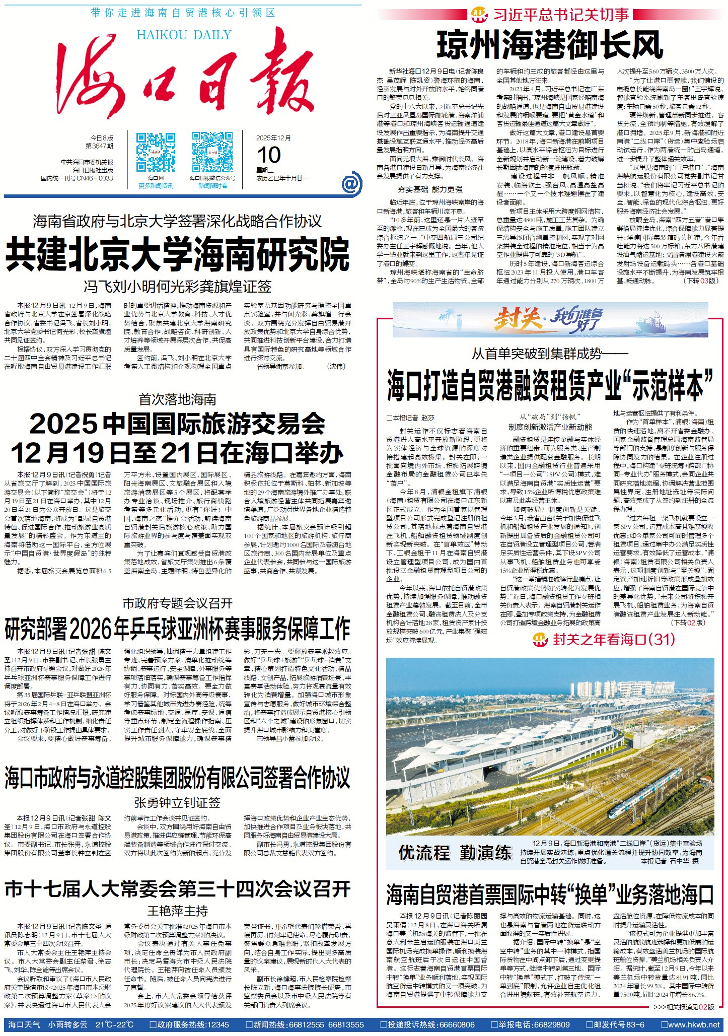 12月10日,市委深改委暨自贸港工委会议召开,深入学习贯彻习近平总书记在听取海南自由贸易港建设工作汇报时的重要讲话精神,传达学习省委深改委暨自贸港工委会议精神,研究部署封关运作准备、风险防控、重点领域改革等工作。市委书记、市委深改委(自贸港工委)主任范少军主持会议。