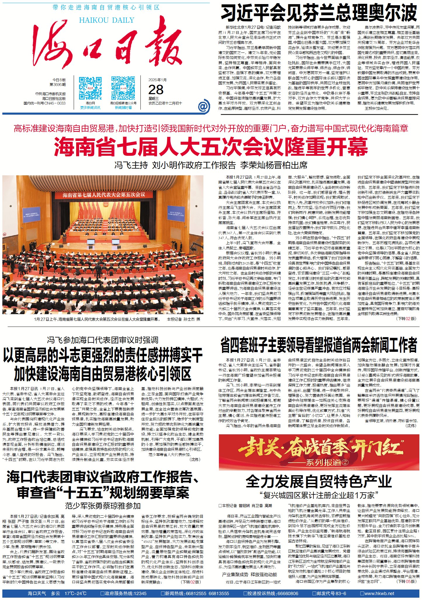 1月27日,省人大代表、省委书记、省人大常委会主任冯飞来到省七届人大五次会议海口代表团,同代表们共同审议政府工作报告,审查海南省国民经济和社会发展第十五个五年规划纲要草案等文件。