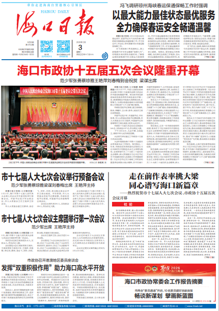 2026年2月3日上午,海口市第十七届人民代表大会第七次会议在市委党校隆重开幕。来自全市各区各行各业的市人大代表齐聚一堂,认真履行宪法和法律赋予的神圣职责,为高标准建设海南自由贸易港核心引领区和“六个之城”贡献智慧和力量。