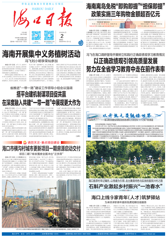 4月1日,省委书记冯飞结合在树立和践行正确政绩观学习教育中查摆出的生态环保、教育优质均衡发展、基层医疗服务、产业园区发展等领域问题整改,在海口市调研督导学习教育开展情况。