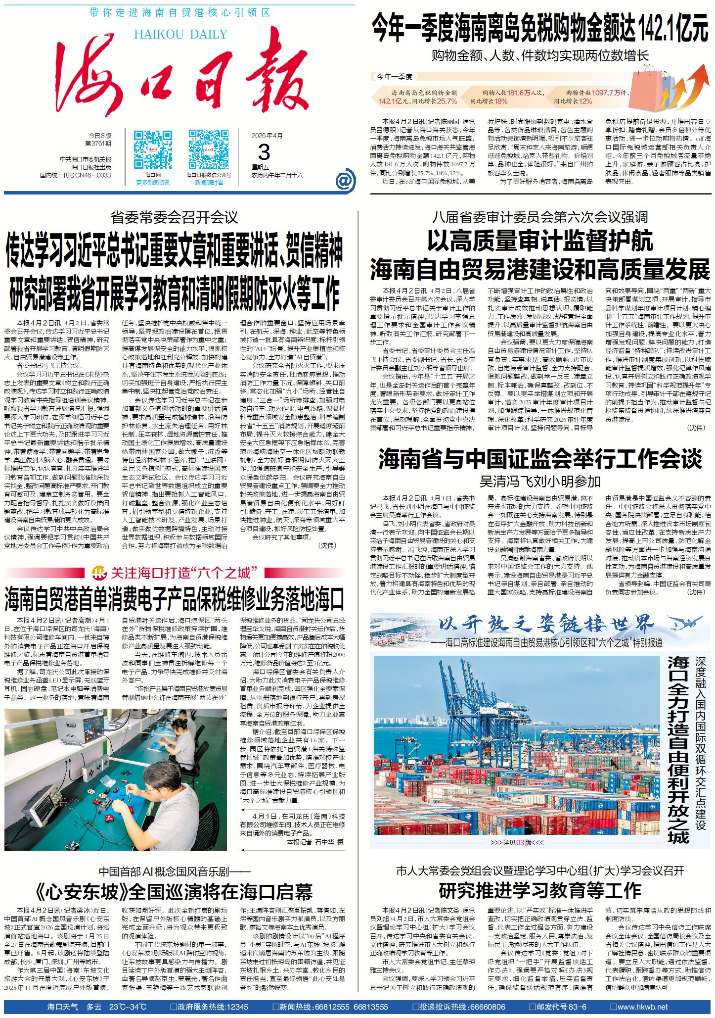 4月2日,省委常委会召开会议,传达学习习近平总书记重要文章和重要讲话、贺信精神,研究部署我省开展学习教育、清明假期防灭火、自由贸易港建设等工作。省委书记冯飞主持会议。