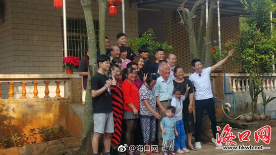【《视界看中国》节目中一张特殊的“全家福”!】在演丰镇黄宏远家中,《视界看中国》节目主持人撒贝宁和嘉宾潘石屹、刘乙一同与黄宏远一家合影留念,拍下一张特殊的“全家福”。(海口网记者 刘杰)