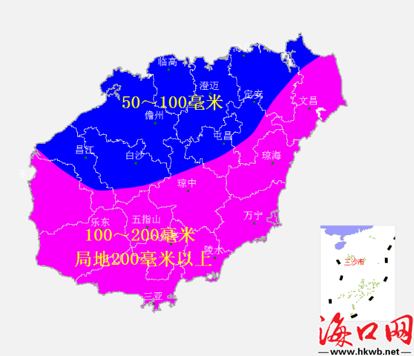海南省气象台预计,6日,海南岛东半部地区有大到暴雨、局地大暴雨,西半部地区有中到大雨、局地暴雨。7日,海南岛南半部地区有大到暴雨、局地大暴雨,北半部地区有中到大雨、局地暴雨。另外,6日夜间~7日,海南岛四周沿海陆地将出现7~8级、阵风9~10级的大风。