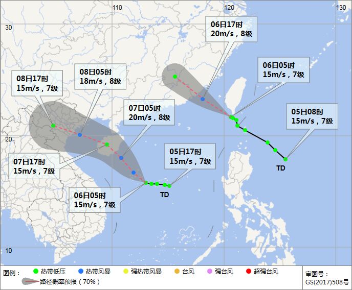 海南省气象台预计,该低压中心将以每小时15公里左右的速度向西北方向移动,强度逐渐加强,有可能于未来12~24小时发展为台风(热带风暴级),并将于7日下午在海南岛东部一带沿海登陆(热带风暴级,8~9级,18~23米/秒)。