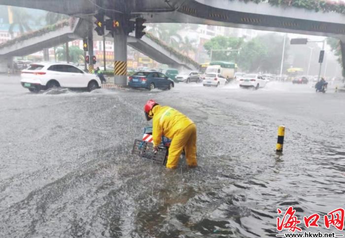 排水工人在路面上做好雨天排水工作。(海口市市政排水事务中心供图)