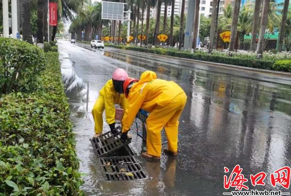 排水工人在路面上打开井盖加快排水。 (海口排水设施事务中心供图)