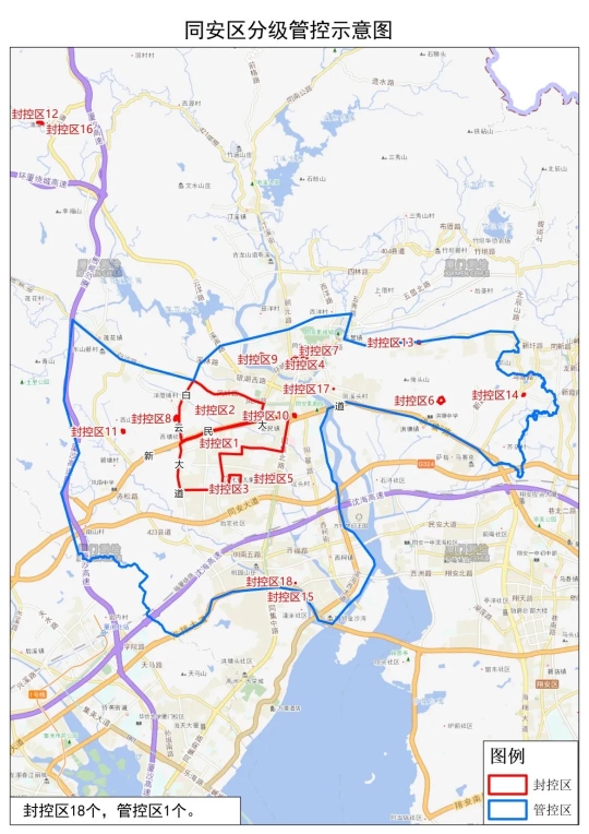 二、将西溪以西,厦沙高速以东,同莲路、同安大道及同新路以南,海翔大道及旧G324国道以北区域划定为管控区,实行“非必要不出门,严禁聚集”。