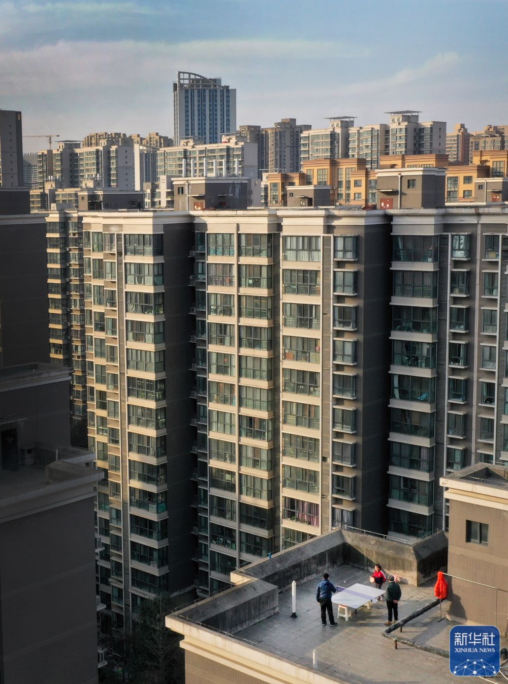 1月13日,西安市一小区居民在楼顶上休闲锻炼(无人机照片)。