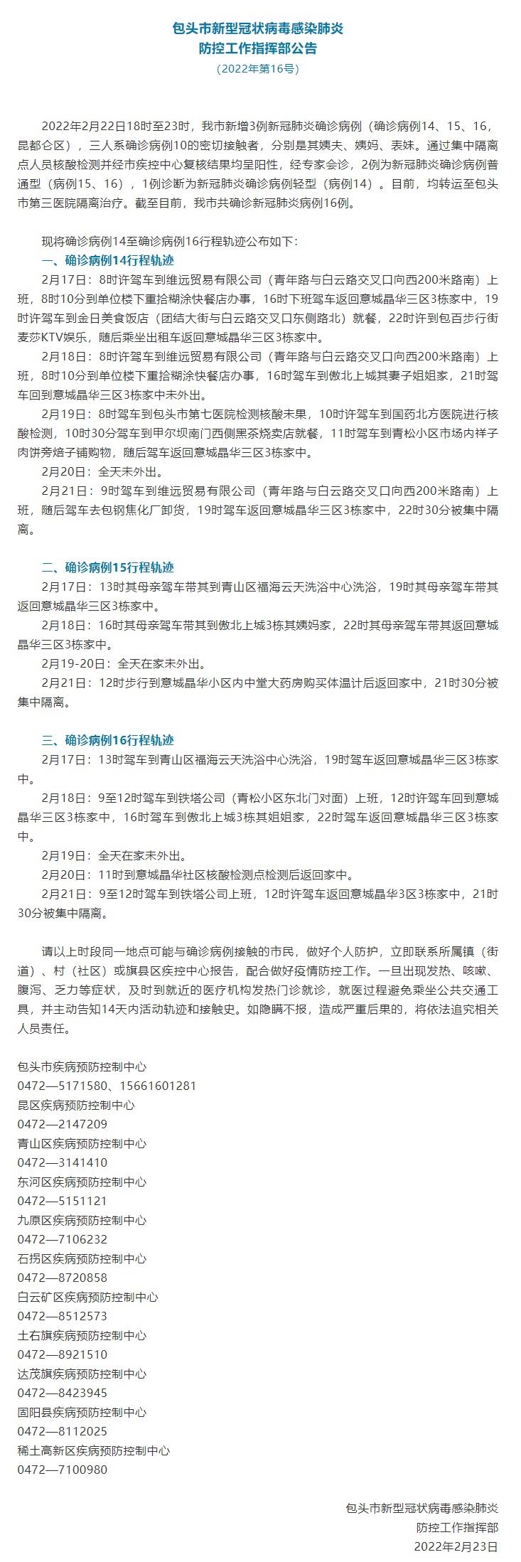 【内蒙古包头新增3例确诊病例 行程轨迹公布】据内蒙古包头市新型冠状病毒感染肺炎防控工作指挥部2月23日消息,2月22日18时至23时,包头市新增3例新冠肺炎确诊病例(确诊病例14、15、16,昆都仑区),三人系确诊病例10的密切接触者,分别是其姨夫、姨妈、表妹。通过集中隔离点人员核酸检测并经市疾控中心复核结果均呈阳性,经专家会诊,2例为新冠肺炎确诊病例普通型(病例15、16),1例诊断为新冠肺炎确诊病例轻型(病例14)。目前,均转运至包头市第三医院隔离治疗。