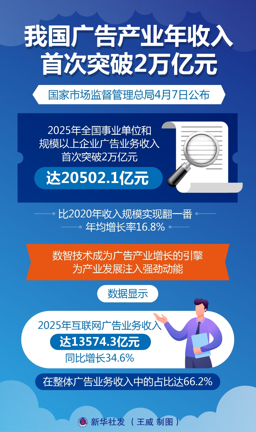 国家市场监督管理总局7日公布,2025年全国事业单位和规模以上企业广告业务收入首次突破2万亿元,达20502.1亿元,比2020年收入规模实现翻一番,年均增长率16.8%。