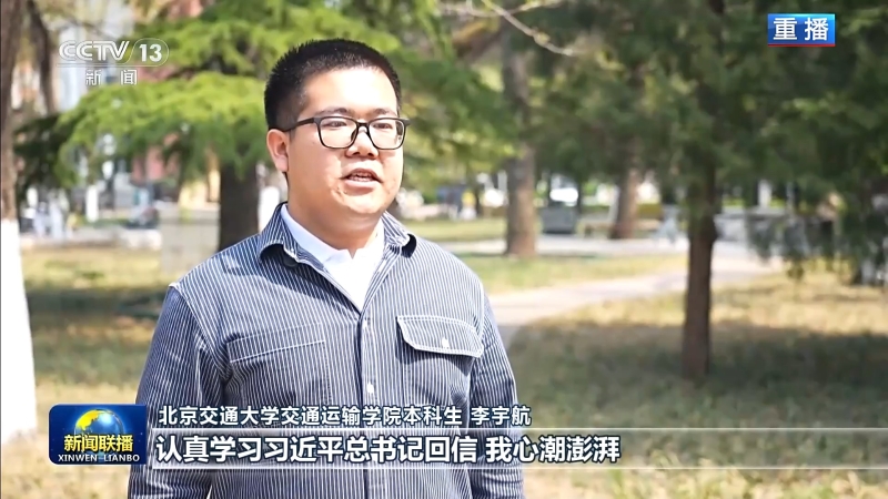 北京交通大学交通运输学院本科生 李宇航:认真学习习近平总书记回信我心潮澎湃。我们要以青春行动接续传承,赓续交大报国传统,深耕交通领域前沿研究,努力把青春汗水挥洒在祖国交通事业的第一线。