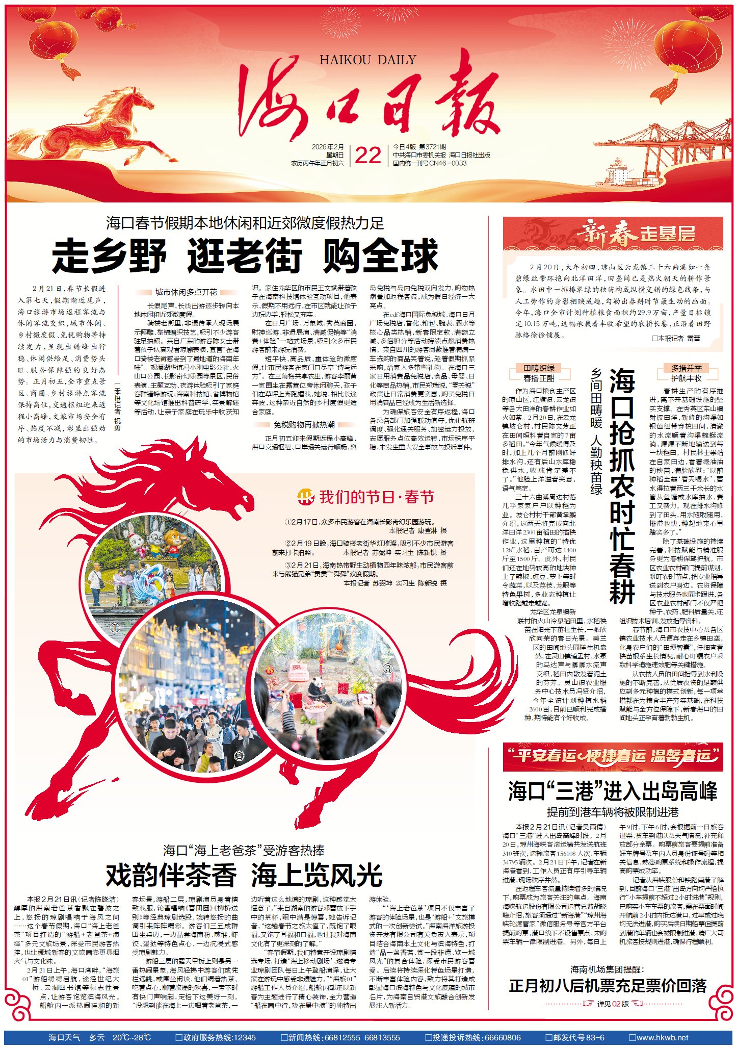 2月21日,假期渐近尾声,海口旅游市场返程客流与休闲客流交织,城市休闲、乡村微度假、免税购物等持续发力,呈现出错峰出行稳、休闲供给足、消费势头旺、服务保障强的良好态势。正月初五,全市重点景区、商圈、乡村旅游点客流保持高位,交通枢纽迎来返程小高峰,文旅市场安全有序、热度不减,彰显出强劲的市场活力与消费韧性。
