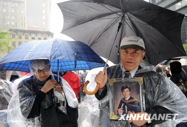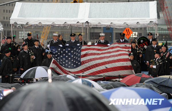 2009年9月11日,在美国纽约世贸中心遗址附近,市民冒雨参加“9·11”恐怖袭击事件八周年纪念活动。当日,“9·11”恐怖袭击事件八周年纪念活动在世贸中心遗址附近举行。新华社记者刘欣摄