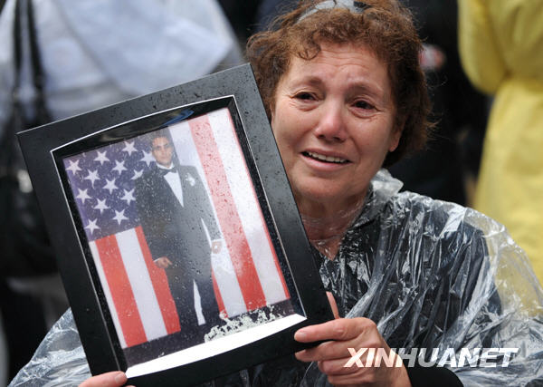 2009年9月11日,在美国纽约世贸中心遗址附近,一名妇女手持遇难亲人的照片,参加“9·11”恐怖袭击事件八周年纪念活动。当日,纽约举行“9·11”恐怖袭击事件八周年纪念活动,遇难者的亲属、友人纷纷来到世贸中心旧址缅怀故人。新华社记者谷欣容摄