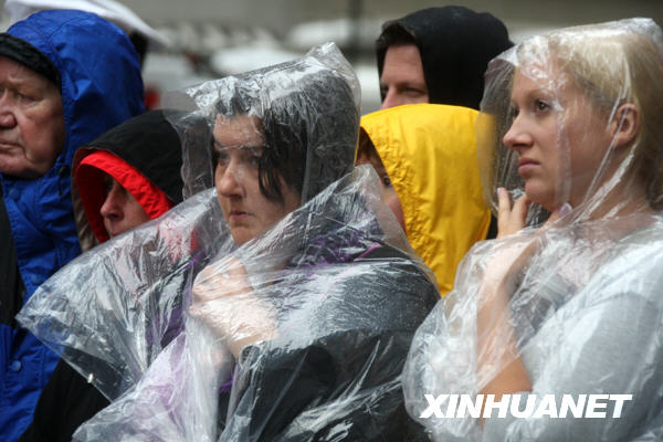 2009年9月11日,在美国纽约世贸中心遗址附近,人们冒雨参加“9·11”恐怖袭击事件八周年纪念活动。当日,纽约举行“9·11”恐怖袭击事件八周年纪念活动,遇难者的亲属、友人纷纷来到世贸中心旧址缅怀故人。新华社记者谷欣容摄