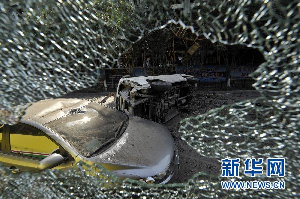 9月15日,乌鲁木齐市红山路上,被倒塌的塔吊砸坏的汽车还停在现场,路过的一辆公交车车窗玻璃被砸碎。 9月15日12时40分左右,乌鲁木齐市红山路“新时代广场”建筑工地一塔吊顶部倒塌,截至14时,已造成至少两人受伤,1人伤势严重,6辆汽车不同程度受损,伤者已被送往医院。目前,事故原因正在调查中,工地已经停止施工。新华社记者 沈桥 摄