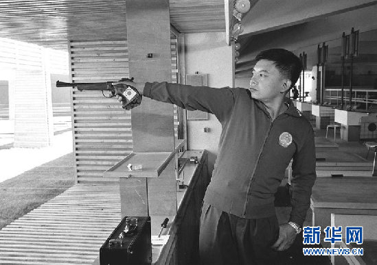 图为中国选手苏之渤在德黑兰举行的第七届亚运会射击赛场留影。他在本届亚运会自选小口径手枪50米慢射比赛中,以552环的成绩获得冠军。这是中国在亚运会上获得的第一枚金牌。 新华社发