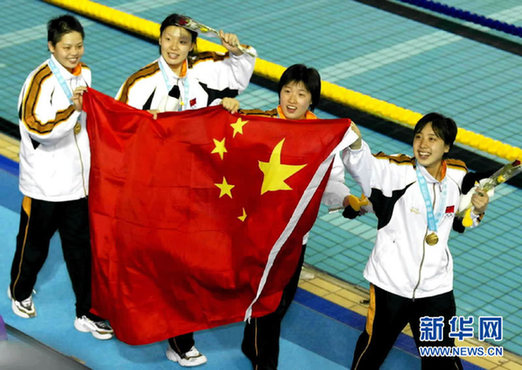 图为2002年10月5日,由战殊、罗雪娟、周雅菲、徐妍玮(从右至左)组成的中国队在釜山举行的第14届亚运会女子4X100米混合泳接力比赛中,以4分00秒21的成绩打破亚运会纪录,并将本届亚运会游泳项目最后一枚金牌收入囊中。新华社发