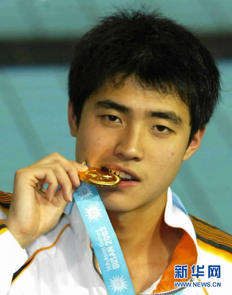 图为2002年10月5日,在韩国釜山举行的第14届亚运会男子200米仰泳决赛中,中国选手吴鹏以2分00秒40的成绩夺得金牌。这是15岁的吴鹏第一次参加国际大型比赛,他独得男子200米仰泳、200米蝶泳和400米个人混合泳的三项冠军。新华社发