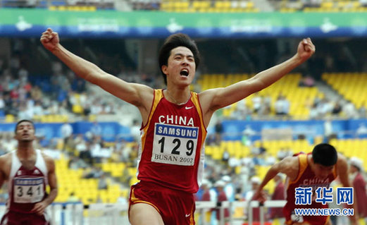 图为2002年10月9日,中国选手刘翔在釜山举行的第14届亚运会田径男子110米栏决赛中,以13秒27的成绩夺得金牌。新华社发