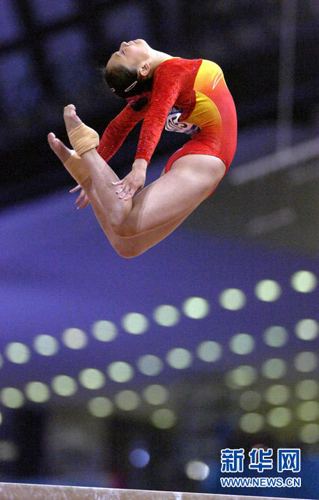 图为2006年12月6日,中国选手张楠在多哈举行的第15届亚运会体操女子平衡木比赛中夺得金牌。这也是中国队自1974年首次参加亚运会以来所夺得的第100枚体操金牌。新华社发