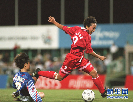 图为1994年10月12日,中国队球员孙雯(右)带球进攻。当日,在日本广岛举行的第十二届亚运会女子足球决赛中,中国队以2比0战胜东道主日本队,获得冠军。新华社发