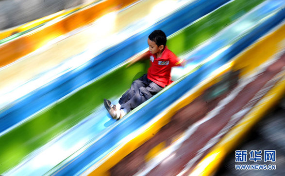 这是一名男孩在菲律宾马尼拉的卢内塔公园里玩滑梯。(2010年5月29日摄)新华社发