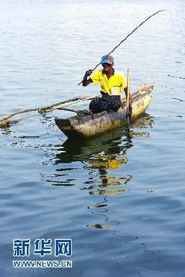 2月26日,在斯里兰卡首都科伦坡以南约60公里的本托特,一个斯里兰卡人在潟湖里垂钓。(作者:刘咏秋)