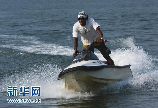 2月26日,在斯里兰卡首都科伦坡以南约60公里的本托特,一个斯里兰卡人在潟湖里驾驶摩托艇。(作者:刘咏秋)