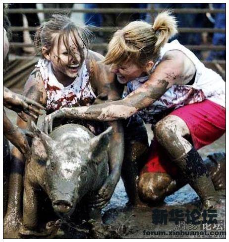 4、人猪摔跤赛:2006年8月3日,美国怀俄明州举办了第一届人猪摔跤赛,各个参赛队的队员们使出浑身解数,与猪角力,场面热闹非凡。