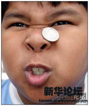 7、用面部肌肉挪硬币比赛:菲律宾男孩们进行的一项比赛,他们要将一枚硬币从前额挪到嘴里,条件是不能用手帮忙,只能靠面部肌肉的运动。