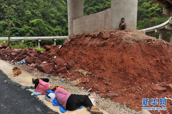 7月8日,因公路中断,沿新公路步行外出的两位妇女在路边就地睡觉解乏。新华社记者陈海宁摄