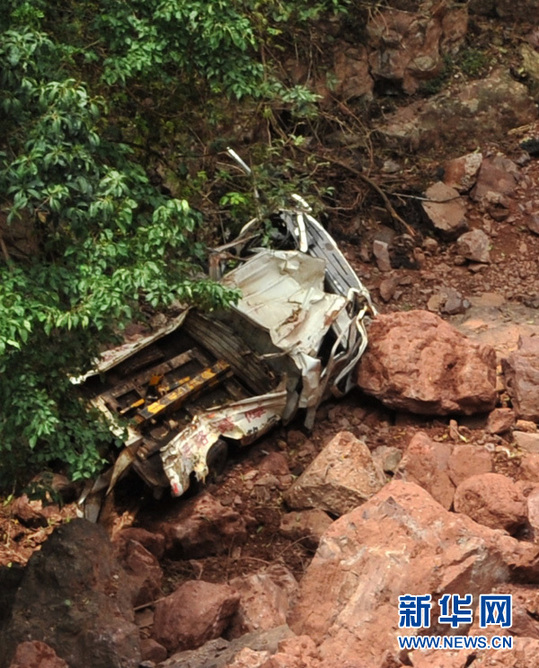一辆在公路坍塌时翻下深山的汽车残骸(7月8日摄)。新华社记者陈海宁摄