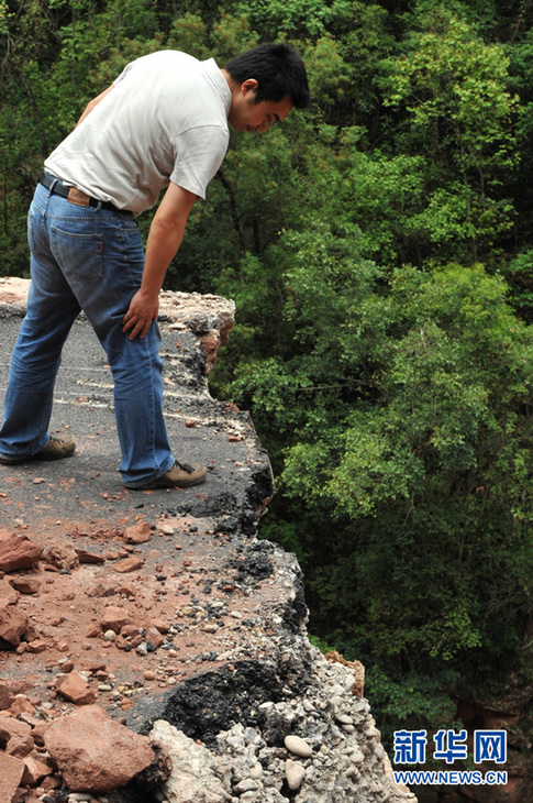 7月8日,“中国网事”记者在塌毁路段断头处察看灾情。新华社记者陈海宁摄