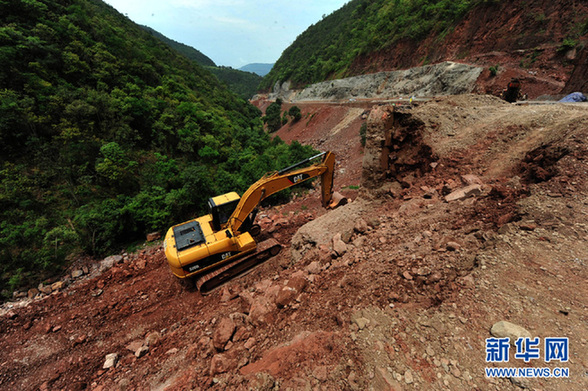 7月8日,一辆大型挖掘机在一处坍塌路段抢险作业。新华社记者陈海宁摄