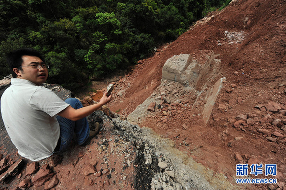 7月8日,“中国网事”记者在塌毁路段断头处察看灾情。新华社记者陈海宁摄