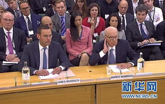 7月19日,在英国伦敦议会下院,传媒大亨默多克(前右)与新闻集团副首席运营官詹姆斯·默多克就窃听事件出席听证会(电视截图)。新华社/路透