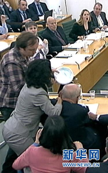7月19日,在英国伦敦议会下院,传媒大亨默多克(右下)就窃听事件出席听证会时遭到一名男子(左)持盘子袭击(电视截图)。新华社/路透