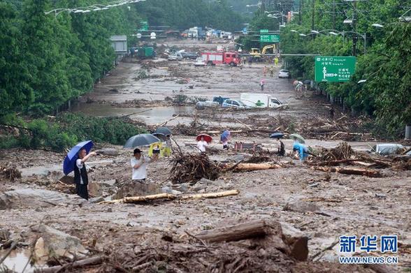 这是7月27日在韩国首尔南部拍摄的遭泥石流冲击的街道。当日,一场强暴雨袭击该国部分地区,引发泥石流。灾难已经至少造成12人死亡。新华社/法新