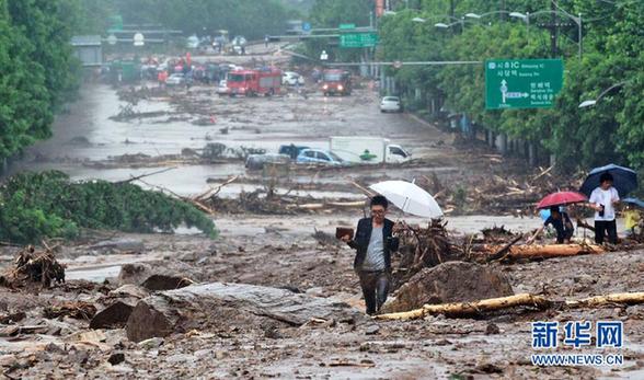 7月27日,在韩国首尔南部,市民行走在遭泥石流冲击的街道上。当日,一场强暴雨袭击该国部分地区,引发泥石流。灾难已经至少造成12人死亡。新华社/法新