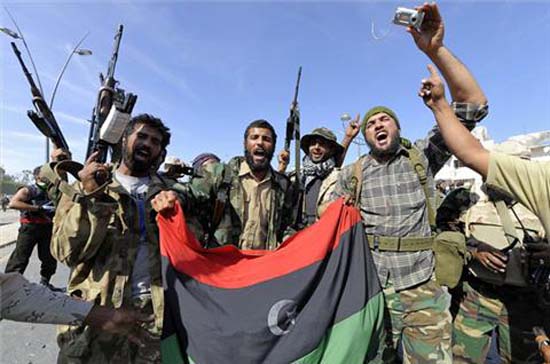 利比亚“过渡委”武装战士们在听到卡扎菲被打死的消息后陷入一片狂欢。