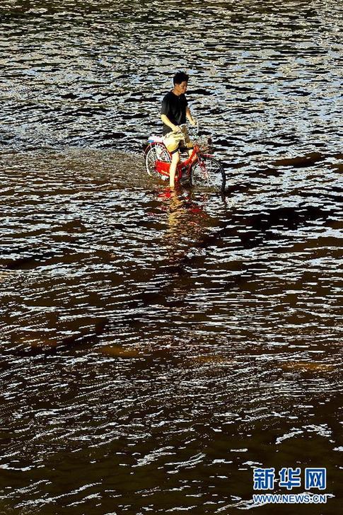 11月6日,在泰国首都曼谷,一名男子在洪水中骑车前行。泰国7月中旬以来遭遇50年不遇洪灾。截至11月6日,洪灾已造成500多人死亡。新华社/路透