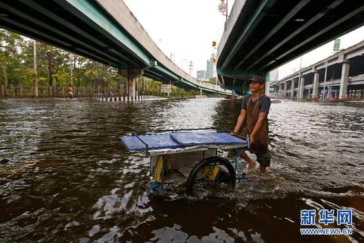 11月6日,在距离泰国首都曼谷市中心不远处,一名商贩推车涉水前行。泰国7月中旬以来遭遇50年不遇洪灾。截至11月6日,洪灾已造成500多人死亡。新华社/法新