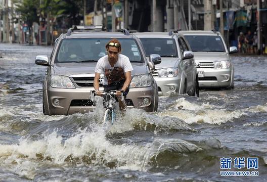 11月6日,在距离泰国首都曼谷市中心不远处,一名男子骑车在洪水中行进。泰国7月中旬以来遭遇50年不遇洪灾。截至11月6日,洪灾已造成500多人死亡。新华社/法新