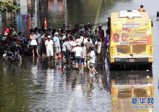 11月6日,在泰国首都曼谷,人们站在被洪水淹没的道路上搭乘公共汽车。泰国7月中旬以来遭遇50年不遇洪灾。截至11月6日,洪灾已造成500多人死亡。新华社/路透