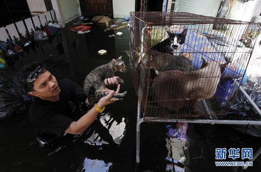 11月6日,在泰国首都曼谷,一名男子将小猫从被洪水淹没的房屋中救出。泰国7月中旬以来遭遇50年不遇洪灾。截至11月6日,洪灾已造成500多人死亡。新华社/路透