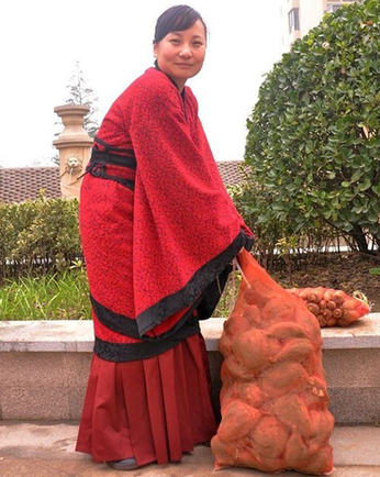 赵阳说,大约一周前,“若即若离”就在威尼斯业主群里和大家说了这个事情,邻居们都非常支持。她和家人今天买了100斤红薯,自己家的红薯已经运回去了,现场的4袋红薯是同事买的,现在同事又去排队买白菜了,她就帮同事看住已经买过的红薯。“若即若离”还让我今天穿着汉服,玩‘穿越’卖买红薯呢。”赵阳说,不管什么形式,能帮“萝卜哥”解决些问题,都感到很快乐。图为美女网友穿汉服帮“萝卜哥”卖红薯。