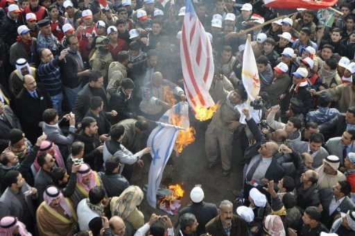 中新网12月15日电据外媒14日报道,数百名伊拉克人在中部城市费卢杰庆祝驻伊美军即将撤出伊拉克。他们放火焚烧了美国和以色列国旗,并高举着写有“我们现在自由了”和“费卢杰是抵抗的火焰”字样的横幅或标语牌。