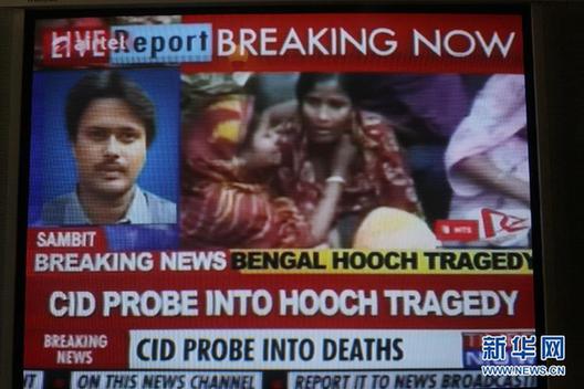 这是12月15日拍摄的西孟加拉邦假酒致死事件新闻的电视画面。据印度报业托拉斯报道,印度西孟加拉邦一村庄13日发生的饮用假酒致死事件至15日已造成107人死亡。当地官员说,4名涉嫌制造假酒的嫌疑人已被当地警方逮捕。医疗队已从加尔各答医院赶往当地参与紧急救治。西孟加拉邦政府已宣布将向每名死者赔偿20万卢比(约合3758.7美元)。新华社记者李毅刚摄